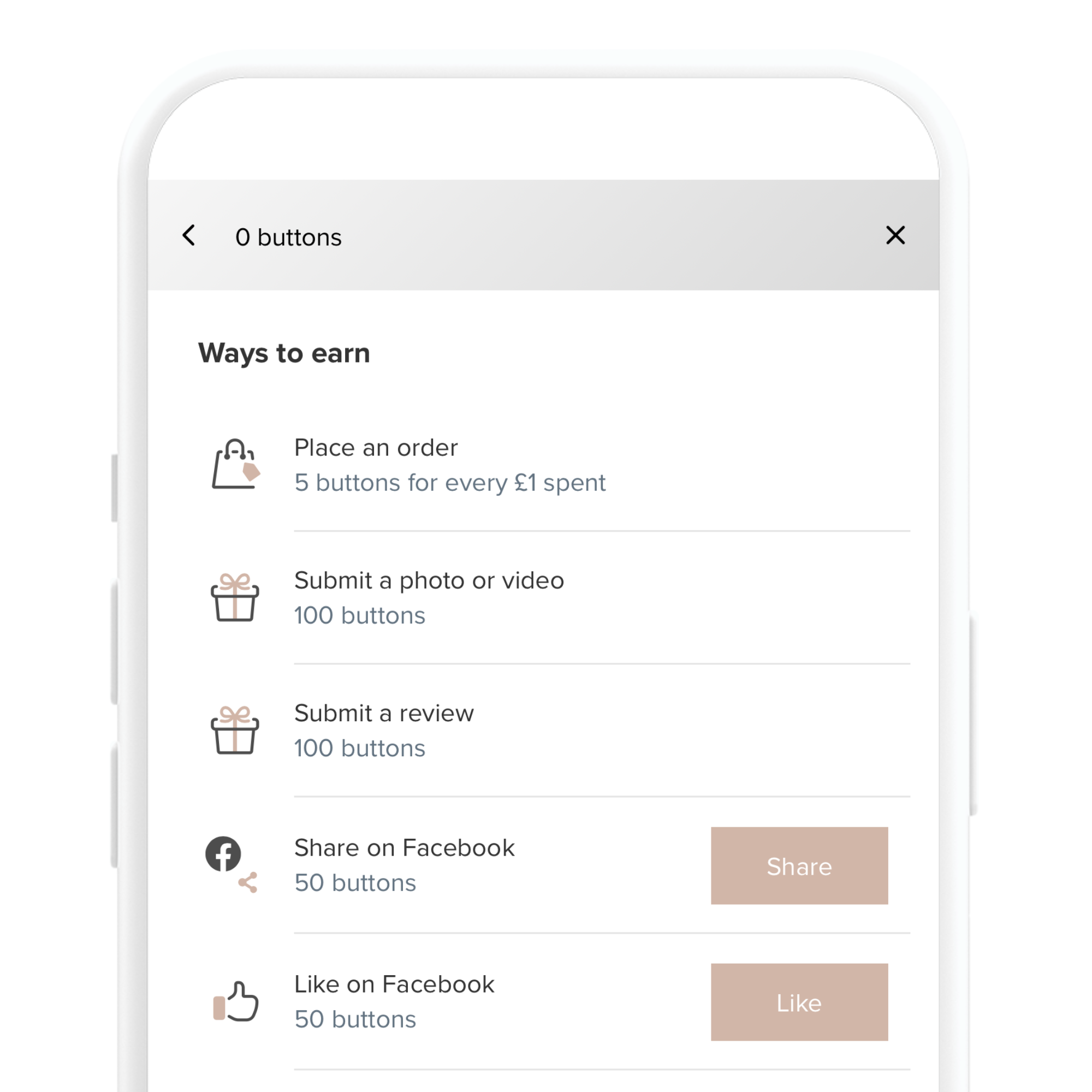 Earn buttons when you shop or complete certain actions. You get 200 buttons just for signing up! Every £1 spent on a purchase equals 5 buttons.