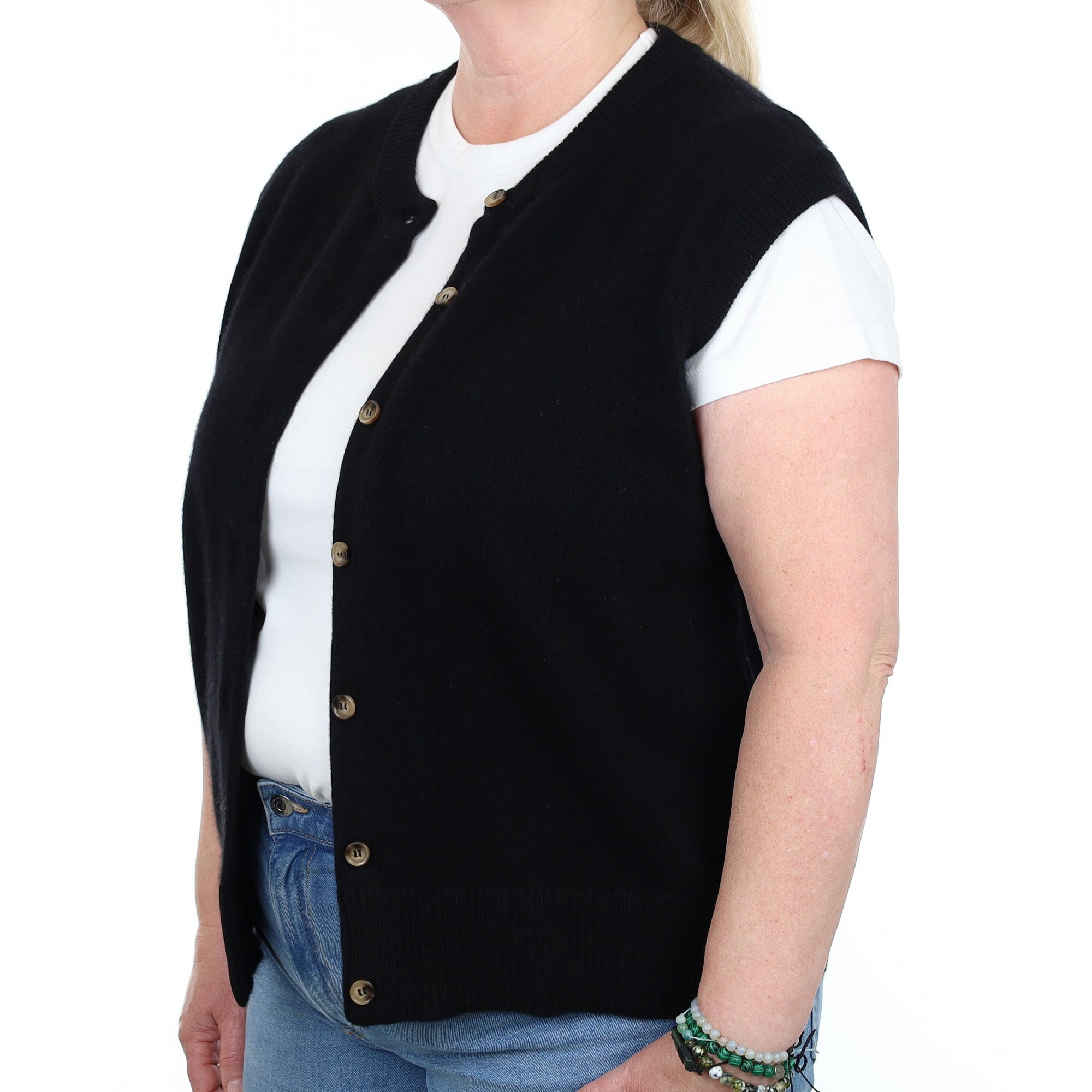 Perfect for all seasons, our luxury cashmere crew neck waistcoat is designed to be stylish whilst also practical and versatile. Wear it on its own or layer it over a shirt or blouse. Leave all buttons done up for a boxy, crew neck fit, or undo the top and bottom buttons for a flattering v-neck shape!