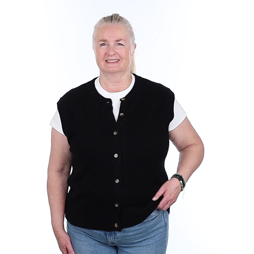 Perfect for all seasons, our luxury cashmere crew neck waistcoat is designed to be stylish whilst also practical and versatile. Wear it on its own or layer it over a shirt or blouse. Leave all buttons done up for a boxy, crew neck fit, or undo the top and bottom buttons for a flattering v-neck shape!