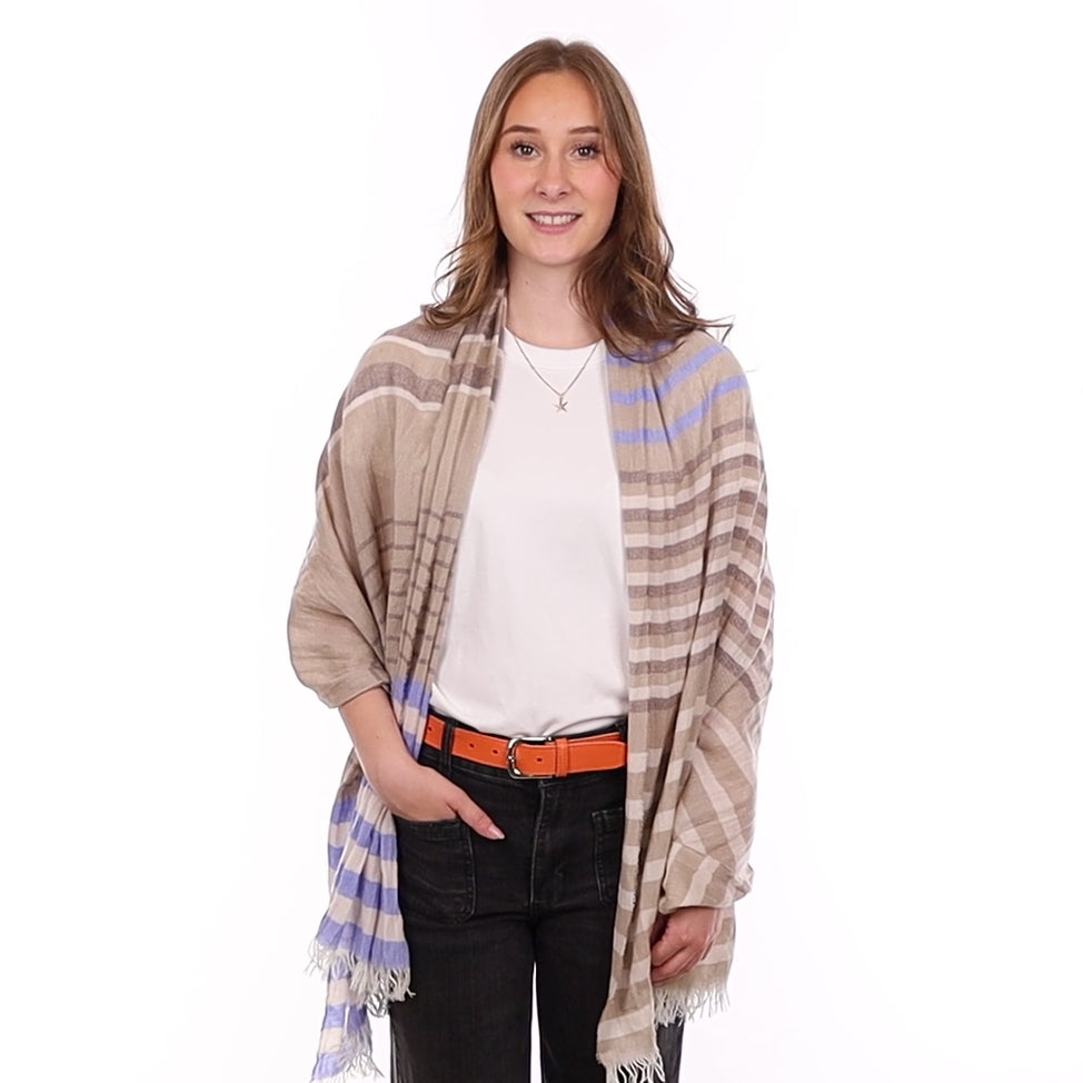 100% cashmere wrap. These casual style wraps are ideal for your holiday. Just twist them up into a knot and pop them in your bag, no need to worry about creases. They can be styled effortlessly over the shoulder or as a scarf.