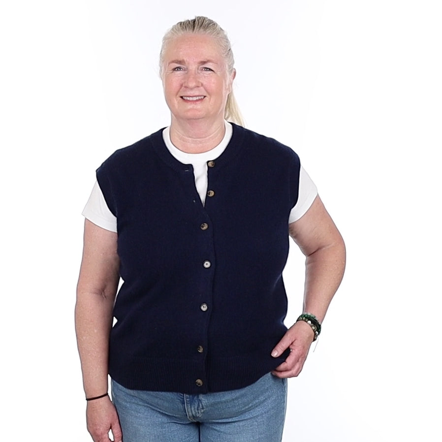 Perfect for all seasons, our luxury cashmere crew neck waistcoat is designed to be stylish whilst also practical and versatile. Wear it on its own or layer it over a shirt or blouse. Leave all buttons done up for a boxy, crew neck fit, or undo the top and bottom buttons for a flattering v-neck shape!