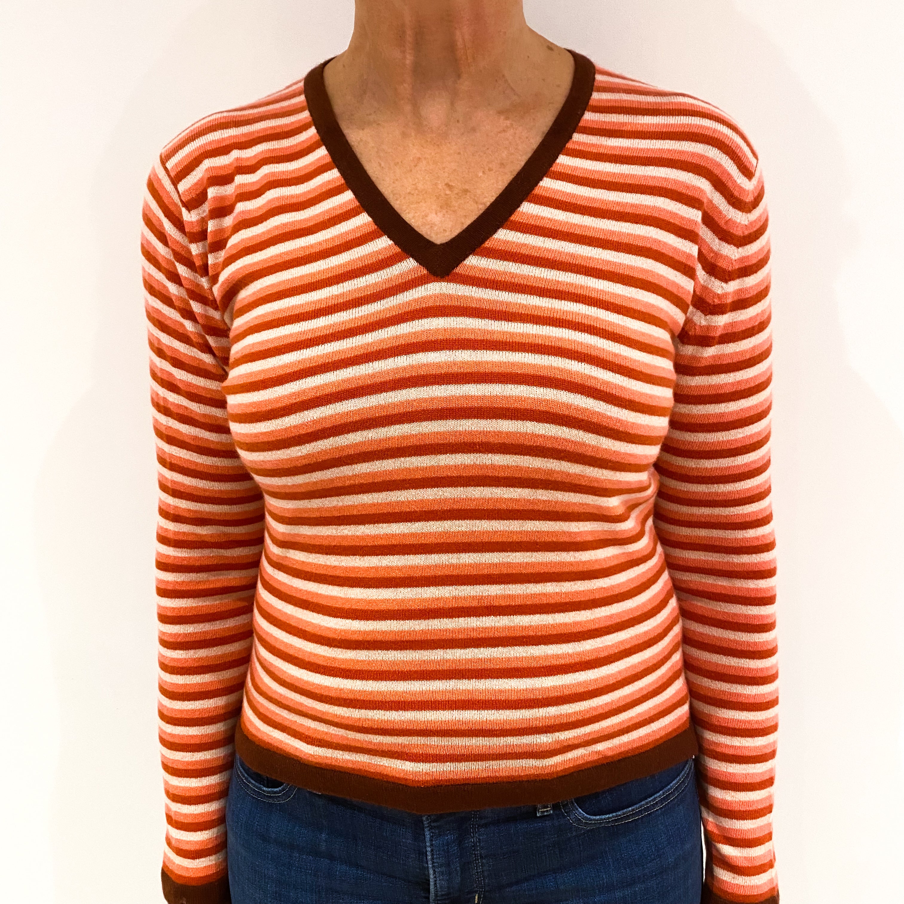 Brand New Scottish Pink, Cream and Red Striped Cashmere V-Neck Jumper Medium